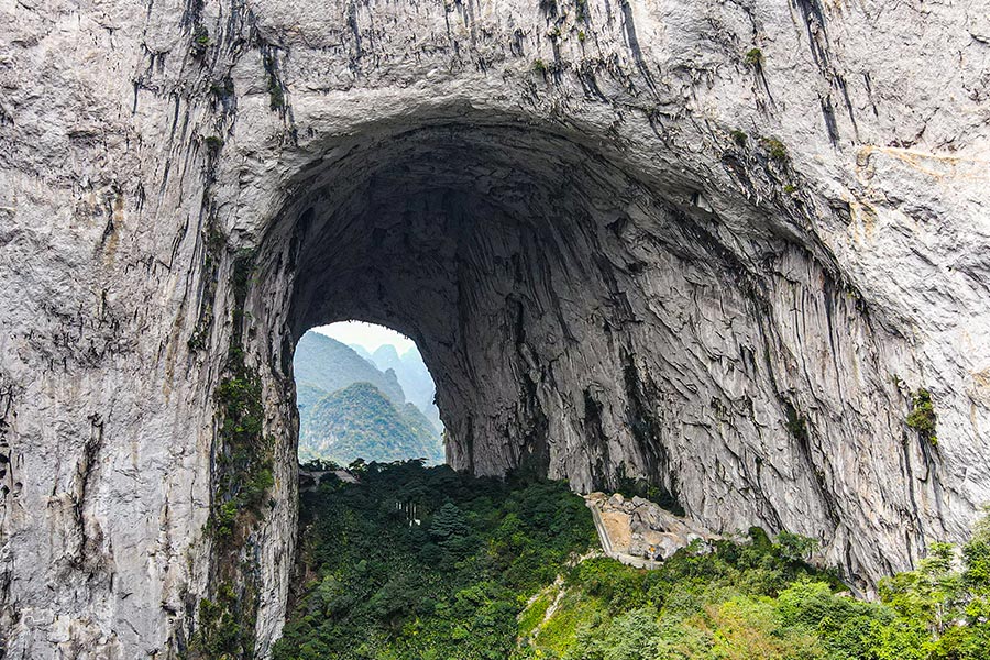 世界二位に輝いているカルスト洞窟は、「苗庁」です。長さ700メートル、幅25メートルを持ち、面積12万ヘクタールあり、洞窟内には、無数の石筍(鍾乳洞の下から上へタケノコのように生じているもの)があります。「大穿洞盲谷」は、世界で最も古い河の遺跡で、閉じられた生態環境の得がたい原始林地帯です。他に、ミャオ族の山や崖にある洞窟に棺を掛ける洞窟葬、人類最後の穴居部落「洞中ミャオ村」などがあります。