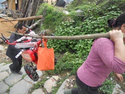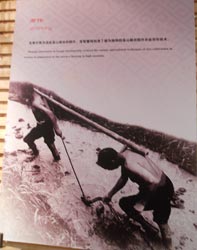 昔、龍脊古壮寨では人で耕しをしていましたが、今では狭くて牛や犁田機が行けない所は人が耕しをするしかありませんが、すこし広い田圃は牛か犁田機で耕しをしています。私たちが行った時はちょうど新しい犁田機を買った村の人に出会いました。犁田機は牛より速く耕すことができますので、人気を集めているそうです。しかし、こんな小さい機械ですが、2,500元もかかるそうです。