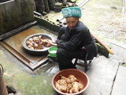 桂林 晴れ 34℃~23℃ 龍脊古壮寨の百年老屋に住んでいるおばあさんが戸口でサツマイモと里芋を洗っていました。おばあさんは八十歳を過ぎていますが、元気にしているようです。たぶん龍脊古壮寨の水、食べ物、空気と関係があるかもしれませんね。