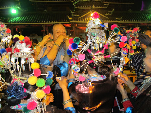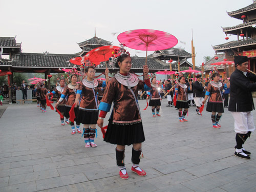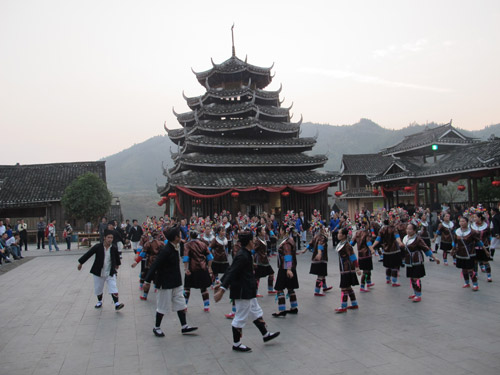 村の入り口で、トン族の衣装を着た村の人達が出迎えてくれました。それから、村の鼓楼の前の広場まであんないしていただき、「油茶」をご馳走しました。地元の人は「油茶」を食べるとき、箸を一本しか使わないのは面白かったです。「百家宴」が始まる前にはまず「芦笙踩堂舞」と「トン族多耶舞」を楽しみました。