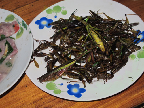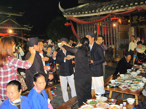 六時に百家宴」は始りました。みんなは席から立ち上がって、お互いに挨拶したり、糯米酒を交わしたりしたあと、食べ始まりました。料理をった各家庭の主婦も参加してくれました。初めはちょっと遠慮しましたがその後、みんなはお碗を持って、ほかのテーブルの方へ回り始まりました。各テーブルの料理がそれぞれ違いますが、ダブルのものもありました。珍しものはいなごと螳螂の唐揚げ、どくだみのサラダと酸魚酸肉などがありました。主食は糯米ご飯、サツマイモとトウモロコシなどでした。最後にはは主と客の間に酒を交わし始まり、宴会は盛り上がってきました。普通はよく男性から女性に、あるいは女性から男性に唄を歌ってから一斉に酒を勧めたのです。酒は糯米で造った日本の清酒のような薄い酒で、飲みやすかったです。主と客の仲はそのうち次第に親しくなってきました。