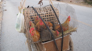 朝、鶏とアヒルを野原まで連れて、放し飼い、夕方また家まで連れて帰るお母さん。今汚染食品が氾濫するので地鶏など汚染のないものはだ人気、多大値段もかなりいい値段で、普通より三倍の値段です。