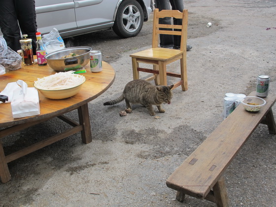 わーっ!飛んで行って参加したくなりますね。熱々の豚汁、それに激辛の香菜と葱を添えて、お行儀なぞ気にせず、立ち食いで胃袋に収めたいですね。写真の友人、各人おしゃべりなどありませんね。バグバグ、ズルズル相手を見据える暇もありません。至福の一時ともうしましょうか。「美味き物を眼前にしては、黙して語らず」。腹ずんと重くなったところで、椅子に座り、油茶をすする、ついつい饒舌がほとばしる。語りに夢中になりにし頃は、すでに帰桂の時刻、時間よ止まれ、しかし、しかしお別れの時「名残は尽きぬ」。此の夜の秦さんぐっすりと眠りに就かれたことでしょう。