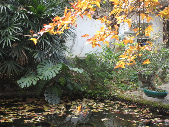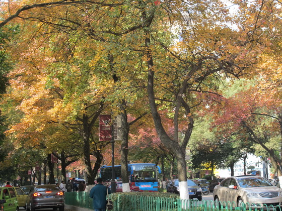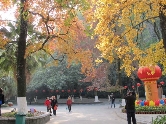 桂林の冷え込みはかなり厳しくなりました。小雨がしとしと降り(下毛毛雨)、体の心底からの冷えを覚えます。陸先生、今日は漓江を跨いで、市内中心地から「解放橋」「漓江橋」へと通ずる「七星区」の案内ですね。学生街「七星区」はどこを歩いても若い学生さんが多くすんでいますねー、王城から南門橋を貫く「中山中路」の喧噪とはまるきり様相が違う、「七星区」の閑散とした文教地区は我々、外国人にあっては心落ち着く場所でもあります。桂林電子科技大学、桂林理工大学、広西師範大学、桂林医学院と。いたるところに「インターネット・カフェ」があり、そこは、朝から夜遅くまで若者が出入りしています。半日も「漓江路」、「普陀路」「龍隠路」「六合路」などの大路を歩けば軽食店、按摩店、名菜店、文房具店、小間物屋、衣服修理店、移動散髪店、携帯電話店、旅行切符販売店など毎日の生活に必要な品物が陳列され値段交渉(讨价还价)がうるさい雀の鳴き声のように聞こえてきます。たまには息抜きのため、「七星公園」、「穿山公園」に御握り、水筒持参で出かけるのもよかろうか。写真の紅葉も、もう終わりで、これから新年にかけては葉が落ちた木立の中を歩く風情と、コートの襟を立て、無造作にポケットに手をいれ白い息を吐きながらの往来になりますね。白い湯気が立ち上るところを見つけたら、熱い「蒸饅頭」を両手で支えながら食べましょうか。それでも腹の足しが足りない方は、桂林名物「米粉」を食べ、庶民の生活居住区 「七星」を歩きましょう。白髪姿の老書生「日本人」(私)と遭遇するかも。天才歌人「石川啄木の歌「故郷の訛り懐かし停車場の・・・・・・」と歌われているように、無性に日本語を聴きたい時は、私は、「七星公園」のバス駐車場に出かけます。ここは、毎日のように日本人観光客のツアーに参加している人々が、バスから降り立ちます。ここで小話するのもまた楽しみです。先日は、私の故郷「鹿児島」の個人旅行者が、ガイドと2人で歩いていて、お声をかけ懐かしい「薩摩弁」でおしゃべりできました。「薩摩弁」の声音は独特で、鹿児島以外の人には全くわかりません。世界中歩いても、「薩摩隼人」は、会話聞いただけでわかります。桂林は何百年と広西の行政の中心地、頑固で粘っこい土着の文化と習俗を味わえます。こんな桂林の四季折々の風情を堪能するのも、また楽しいものです。市井の道路端で「綿あめ」を売っ