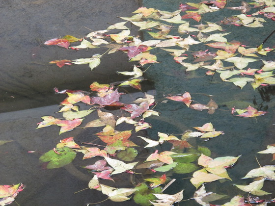 蓮池の水面に浮かんでいる色取り取りの楓の葉
