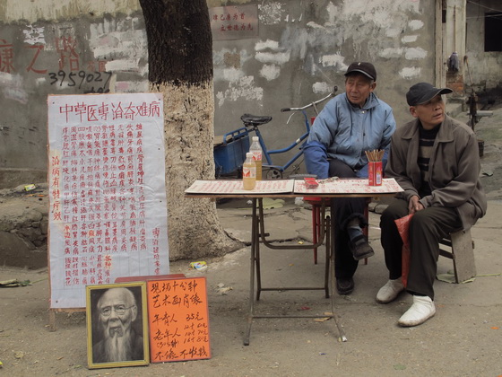 すごい人です。看板によるとここで漢方でほとんどの難病が治療できるそうです。運命を占うこともできます。肖像絵も書けそうです。若い人は一枚35元、年寄りはサイズによって、それぞれ60、70、80元です。かいた肖像は本人に似ていないならお金を取らないなどの内容を書いてあります。