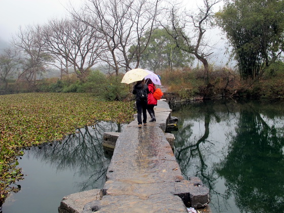 西岸村が終わって、花江の石橋を渡って、東岸村へ向かいました。石橋は全部長さ2メートル以上の細長い石畳で作られています。花江の川は春になると、両岸の木が新芽が芽生えると更に綺麗になるでしょう。