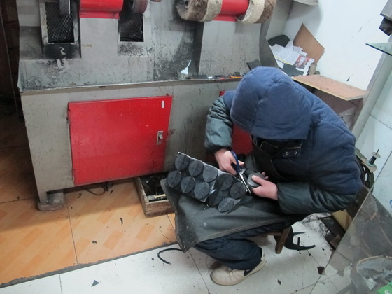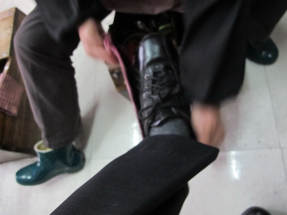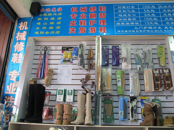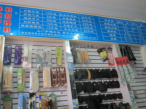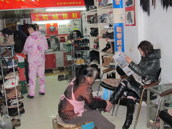 「擦靴店」は近所の「馬坪街」にあります。それほど大きい店ではありません。清潔で、よく片づけられた感じの店です。スタッフは全部で四人いました。その中の夫婦二人は店のオーナです。店が開けっ放しになっているので、寒かったです。靴磨きのほか、靴の修理、除臭などのサービスもするのです。