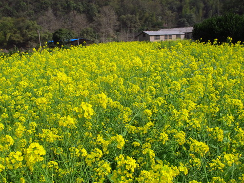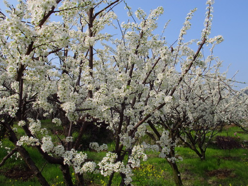 朝八時半ごろ、私たちは桂林市区を出発しました。市街区を出て、三十分経って、大墟鎮に着き、九時半ごろ、潮田郷を通りました。途中は車は少なく、人の姿もほとんど見えませんでした。潮田郷を抜けて、大鏡郷に入りました。車の右側には思安江(灕江の支流)が流れていました。川の両岸の木は黄ばんだ新緑が元気よく伸びて、活力が満ち溢れていました。野原にはあちこち赤とピンクと白などの花が咲いていました。道端の野菜畑に青くてつやつやした韮、黄色い花が咲いている菜花と白い花が咲いている大根などとても綺麗でした。突然、前方に一面雪のような真っ白な花が咲いていました。それを見て、みんなは言い合わせた様に叫びました。近づいて見るとそれは果樹園の李が咲いている花だと分りました。みんなは車を降りて、写真を撮りに行きました。純潔な花がほのかな香りを漂わせていて、そのような花の中にいると思わずその美しい景色に見蕩れてしまいました。土と草と花の匂いを混ぜた朝の空気を吸いながら、下は湿潤な柔らかい土を踏んで上は美しい花を楽しむというような気持は実に爽やかで、忘れ難いです。
