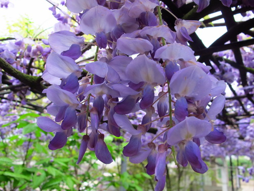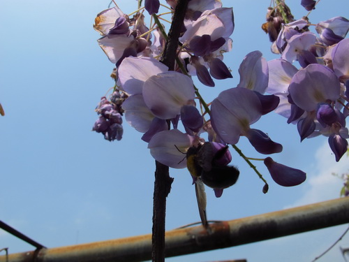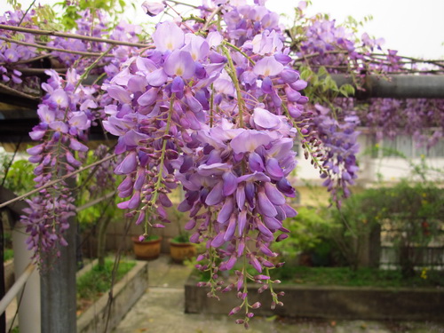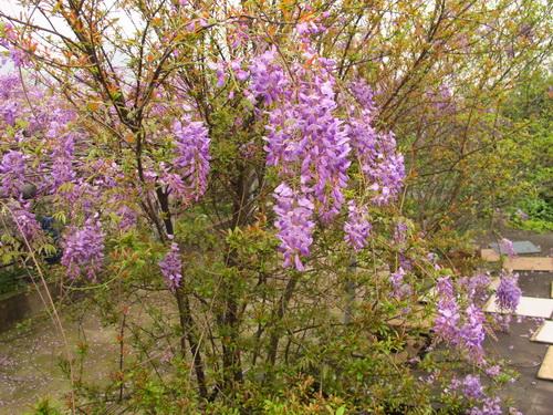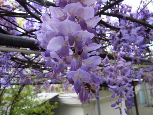 なぜか訳が分からないですが、藤の花が大好きです。子供のころの貧しい時代にアカシアの花と同じように藤の花を食べたことがあります。甘くて、香りがいい藤の花には深い記憶が残されました。先日、我が家の藤の花が満開しました。薄甘い香りを漂わせて、たくさんの蜜蜂と熊蜂が蜜を採りに飛んできて、飛び回っている蜂で屋上ガーデンがとても賑やかになりました。勤勉で、可愛い蜂に楽園を提供できることを嬉しく思いました。麗らかな微風が吹き通る度に、ぶら下がっている一房一房の花が一斉に揺れ、そして蝶蝶みたいな藤の花はひらひらと地面に舞い落ちて、とうとう一面の薄い紫色の絨毯になりました。そのふわふわした天然絨毯を歩き、とてもいい気持ちでした。間もなく我が家の藤の花が散ると思うと、ちょっと寂しくなりましたが、「優しい雨に打たれて落ちる儚さ故、人は愛するのでしょう」と言う歌手の谷村新司の「花」の歌詞が思い出され、釈然しました。