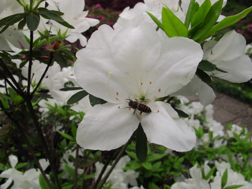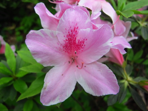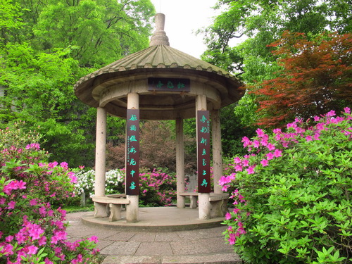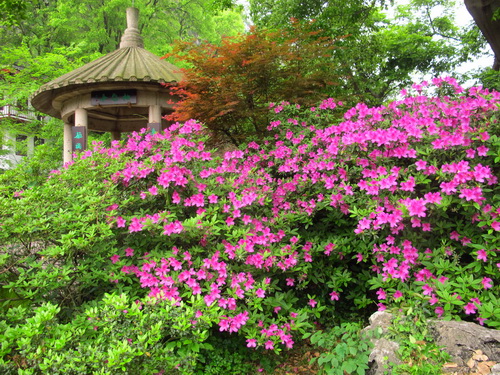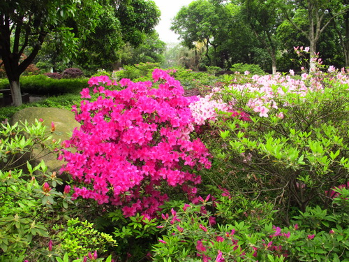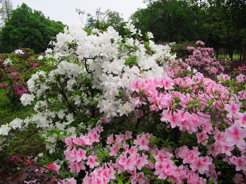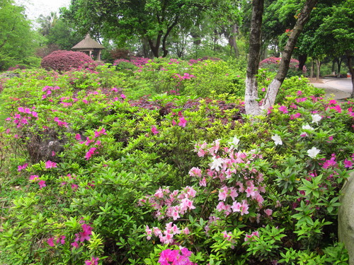 七星公園のつつじの花が満開していると聞いたので、先週の日曜日朝七時ごろ、友人の韓さんと一緒に行きました。つつじの花は中国語で「杜鵑花」、あるいは「映山紅」と言います。「月牙楼」のすぐ横の「杜鵑園」にあります。種類は白、ピンク、赤など五種類ありました。近くの日本八重桜も奇麗に咲いていました。それは桂林の姉妹都市熊本市から贈呈されたものです。