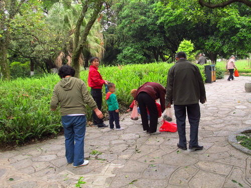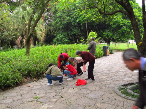 遠くから人人が何かを探しているかのようでした。近づいてみると、金木犀の種を拾っていました。近年、苗木を栽培するため、金木犀の種を回収する人がいます。