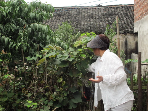 11:40頃、唐さんの家の所在地の「永冨村」に到着しました。車を村役所に停めてから、私たちは歩いて唐さんの家へ行きました。村の出入口に大きな楠木が一本あります。大木の下に売店があります。店の人がのんびりに喋ったり、「字牌」をやったりしていました。私たちを見ると友好的に挨拶をしてくれました。唐さんのご主人の話によるとこの村の人の祖先は湖南省から引越して来たそうです。村には老人と子どもが多かったです。若い人はあまり見えませんでした。中国の田舎はどこへ行っても若者が少ないことは同じです。他の農村と違ったのは村の中に畑と水田がよくあります。そして、ナツメ、梨、桃、ビワなどの果物の木がよく植えられていました。