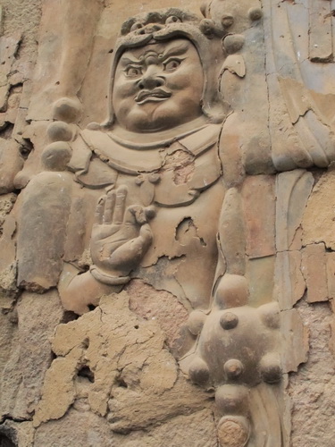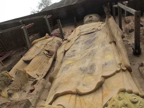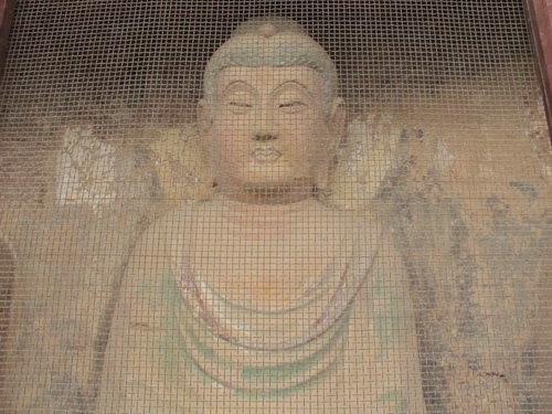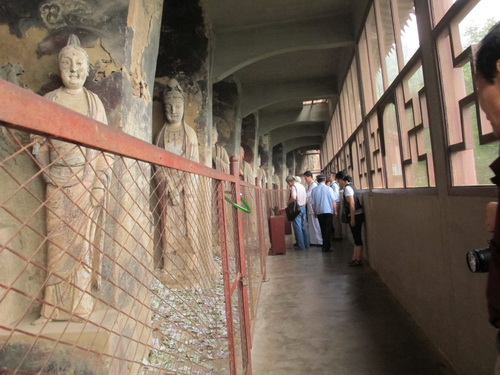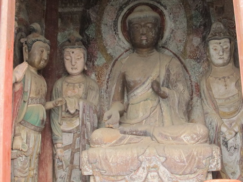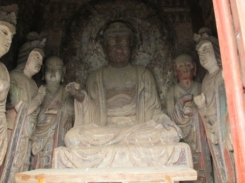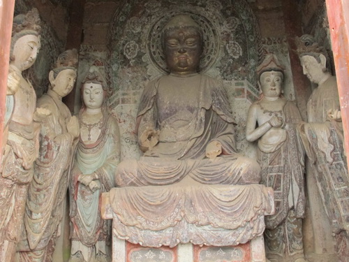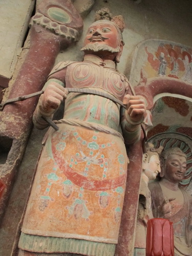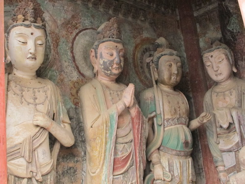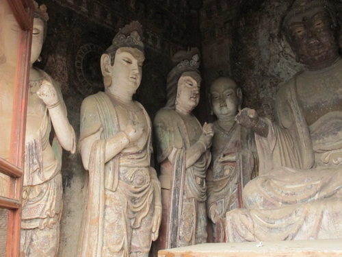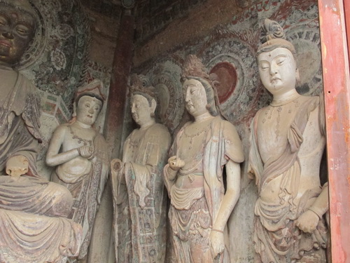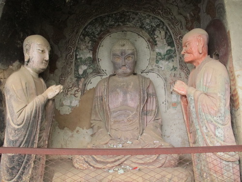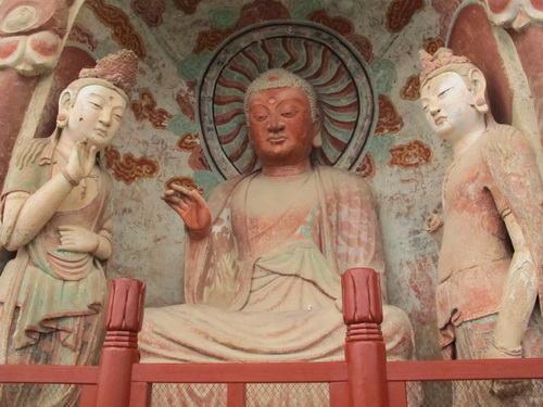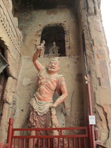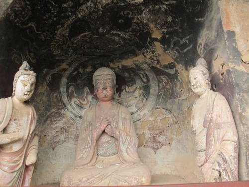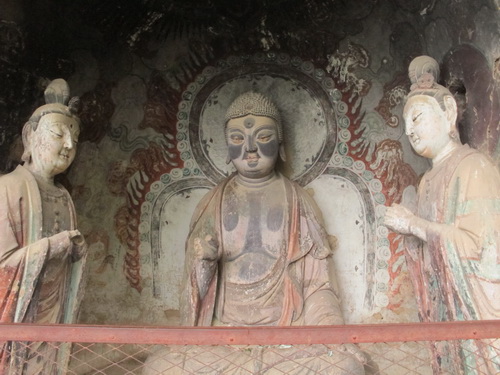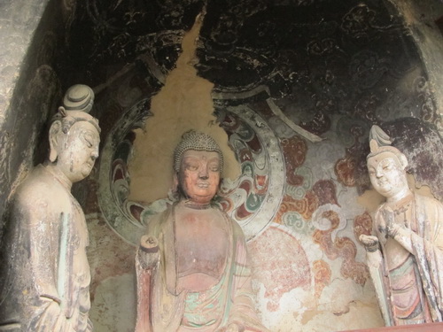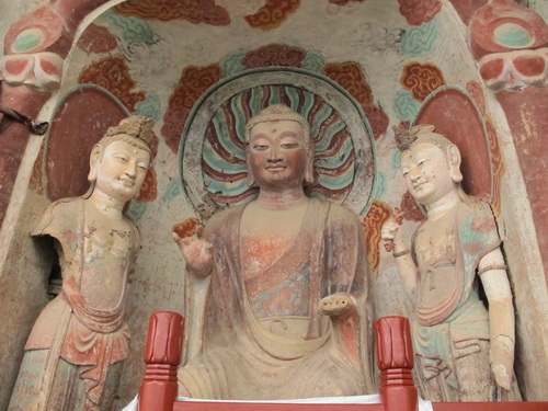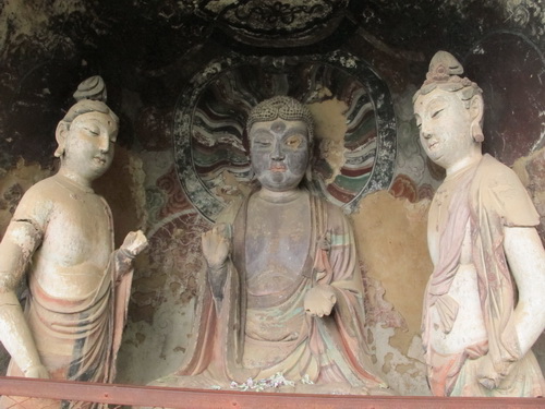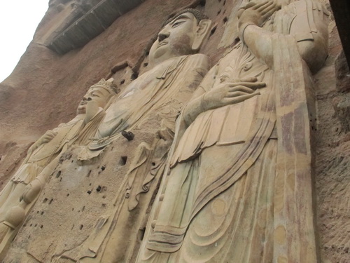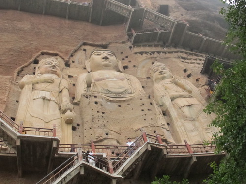 これは「麦積山」で一番大きい彫像です。真ん中の仏像は15メートルもあり、両側に立っている菩薩はにこにこして、まるで往来する観光客を送迎しているようです。この彫像は隋に作られましたが、宋代に修繕されますた。