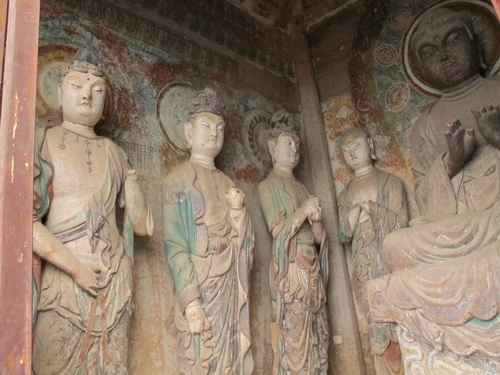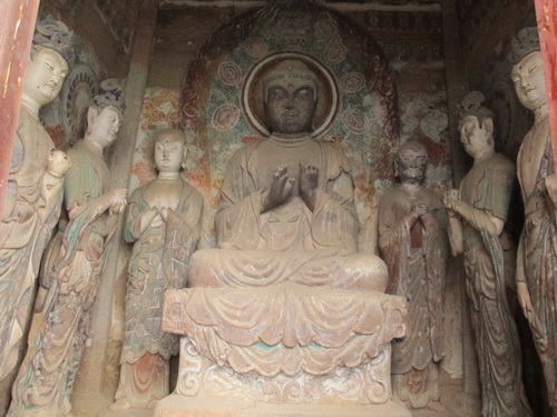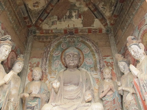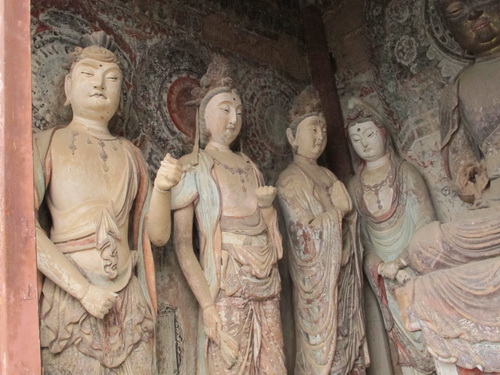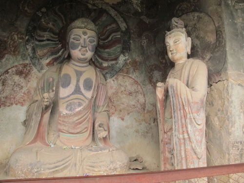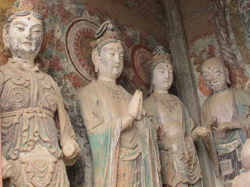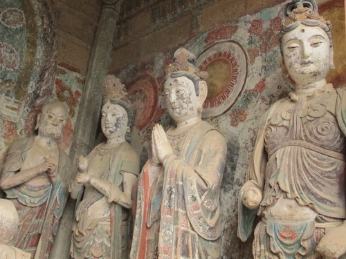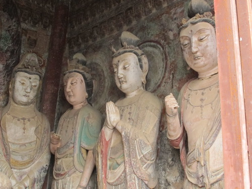 「麦積山」は丹霞地形で、ザラザラの石は細かく刻むことはできないので泥の彫塑で有名になりました。それにほとんどの泥彫塑は色付つられています。