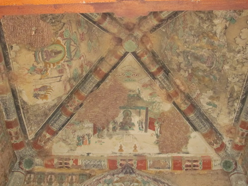 「七仏龕」の洞の中の壁画はみんな明末清初にかき直されたものですが、洞の外の天井にあるのは北周時期の原作です。