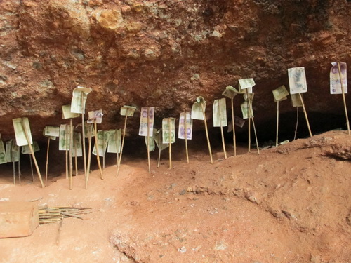 見物が終わって,山の麓に降りるとこんなことを見ました。沢山の人は竹あるいは木の枝で人民元が山と地面の間の隙間に支えました。それによって、その人の腰が丈夫になるそうです。