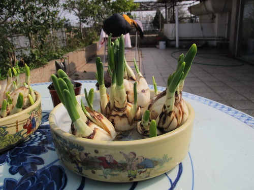 中国の北京などの都市は酷い霧に籠られていますが、桂林は今日ありがたい快晴な天気になりました。冷え込みの天気が二週間も続いた後、久しぶりに小春日和の天気に恵まれました。平日よく朝寝坊をする私は今日早速起きて、屋上に上がって、布団干しをしました。屋上ガーデンの花々は久しぶりでした。温かい日差しを浴びて、寒さに凌いできた蝋梅が咲き誇っていました。紅梅、こぶし、椿などは蕾が膨らんでいました。この前に撒いた香菜と葱がタイミングよく土から芽が出ました。小鳥が飛んできて、枯葉の下に隠れている蚯蚓などの虫を探していました。
