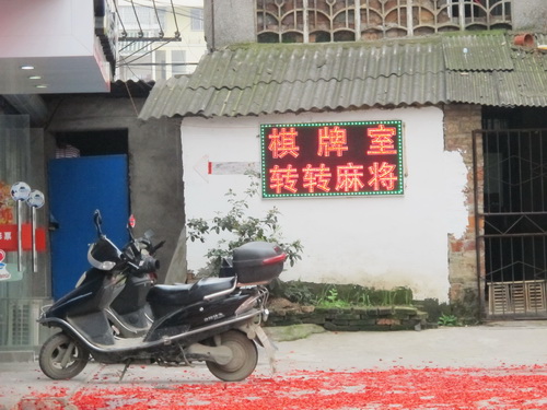 ジャンは中国語で「麻将」と言います。マージャンすることは「打麻将」、あるいは「打牌」と言います。「マージャン室」は中国語は「麻将室」(majiangshi)、あるいは「棋牌室」(qipaishi)と言います。マージャン室に訪れるお客さんは大抵停年した年配の人と家庭主婦、あるいは決まった職業のない人です。「衛生麻将」(娯楽だけのマージャン)をする人もいますが、お金を賭けてする人はほとんどです。最近、桂林では「転転麻将」は流行っています。参加者は5人で、4人がマージャンをやって、一人が候補で待ちます。誰か勝った人がいたらすぐ下がって、候補する人に席を譲るように転々と廻っていくので、「転転麻将」と言うわけです。「転転麻将」は利点が二つあるそうです。一つには老人が長時間マージャンをして急死したことがあります。「転転麻将」は参加者がよく動くので、血行に良くて肩こりと急死のことをある程度防ぐことができます。二つには勝負の程度が制限されているので、みんなが楽々でマージャンをすることができます。三つ目は「転転麻将」のやり方はわりあい公平で、コンビで詐欺することを防ぐことができます。以上の原因で桂林では「転転麻将」はよく流行っているようになってきました。