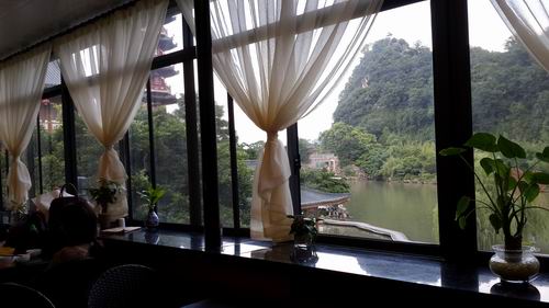 店の中から有名な観光地の畳彩山が見えます