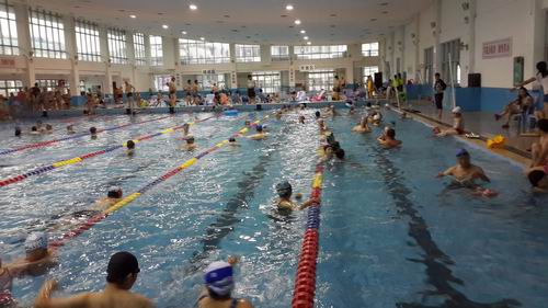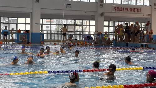 桂林の穿山体育館のプールで水泳を楽しむ市民で賑わっています