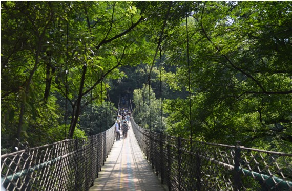 一番上にある滝まで、その後は階段の道を歩き続きます。途中、「虹橋」という美しい名前が付けられた吊橋を渡りました。