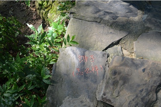 降りる階段に桂林語の発音とその意味が彫ってあります。桂林語の発音「ランズ」の意味は「どう」です。面白いでしょう。