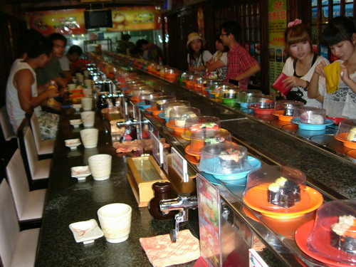 夕食の時間になると「90後」の若者が好んで来る正陽路にある日本料理の回転寿司店で、味もおいしいし、見た目も綺麗な日本食に魅力を感じています。
