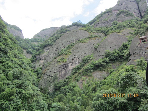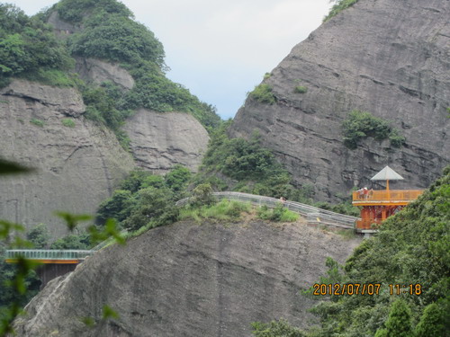 私たちが資江の岸辺に整備された約180段の階段を登り、ケーブルカーの乗り場に着き、そこから二人一台ずつのゴンドラに乗りました。10分ほどして長さ443.8mの距離を移動した後、上の終着点に着きました。実は下の乗り場から上の終着点までの間に標高209.59m の落差があるというデータがあります。確かに世界でも珍しいほどの角度(29.6度)で設置したこのケーブルカーなのでしょうか?私たち誰もがぐんぐん天の梯子に登って行くような錯覚に陥り、下界にある資江や山々がますます一望のもとに納められました。こんな気楽な気分で、これほど雄大な丹霞地形が見渡せることができることは昔では考えられないことでしょう。ここから更にガラス張りの展望台まで約460段の下りや登りの階段が整備されています。(これらの階段の整備にちょっと問題があるような気がして、もう少し楽に歩けるように整備すればいいのにと考えた)。