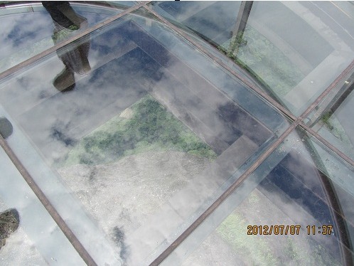 ガラス張りの展望台に辿り着くと、足元の下に透けて見える田のが高い山のいただきでした。鮮明に透けて見えた山の頂上にまず息を飲まないではいられませんでした。恐らく度胸の小さい人は歩く勇気がないかもわかりません。さすがに無敵の丹霞地形の景観が私たちの眼下や足元に広がり、やはり、2時間のバスの走行や1000段の階段を登った甲斐がありました。ここで誰でも周りに果てしなく広がる丹霞地形のパノラマの雄大さに圧倒され、魂を震撼させられるほどでした。この雄大な景色を見ると思わずある有名人の言葉の「無限な風光は険しい峰にあり」が思い出されました。実際このガラス張りの展望台は既に資源県の観光業のトレードマークとされ、その宣伝に大童になっているようです。