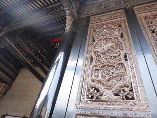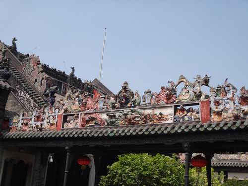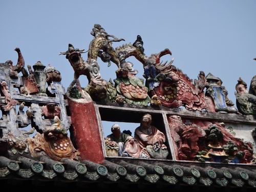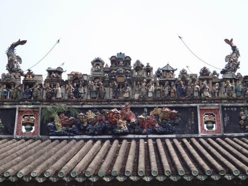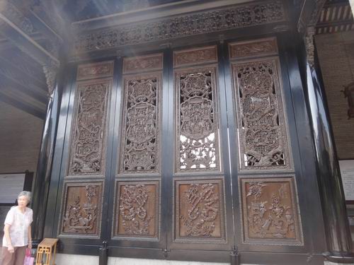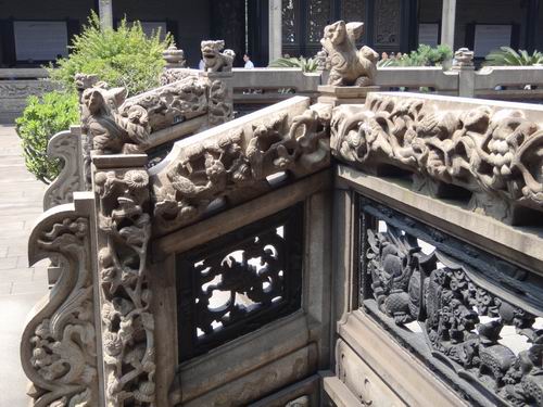 それより最も驚くべきことは書院を構成する細部まで、ふんだんに手の込んだ彫刻の工芸で装飾していることなのです。私たちが玄関の外に立ってみても、既に屋根の上に目を見張るほどの陶彫(焼物)の工芸品がぎっしり色鮮やかに飾っているのが分かりました。それから中に入って見ると更に壁、窓、手摺り、ドア、ホール、梁などのすべての細部にはにきめ細かい彫刻の工芸が華々しく飾られています。そして煉瓦の彫り物、木の彫り物、石の彫り物、焼き物の彫刻、粘土の彫刻による工芸を、それぞれ厳格な使い分けで余すところなく書院の豪華さを際立たせています。まさに中國を代表できる彫刻の工芸の集大成だといっても過言ではありません。