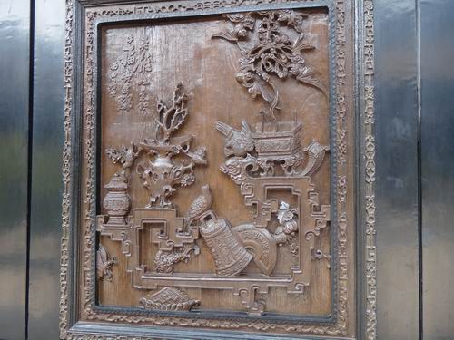 玄関の障壁(衝立と同然のもの)に四枚のきめ細かい彫刻の工芸が使われています。いずれも縁起のいい内容が読み取れます。
