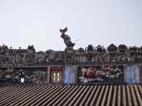 陳氏書院の表玄関の屋根にきれいに飾っている工芸に驚きました。軒下や欄干にもふんだんに彫刻の模様が施されています。