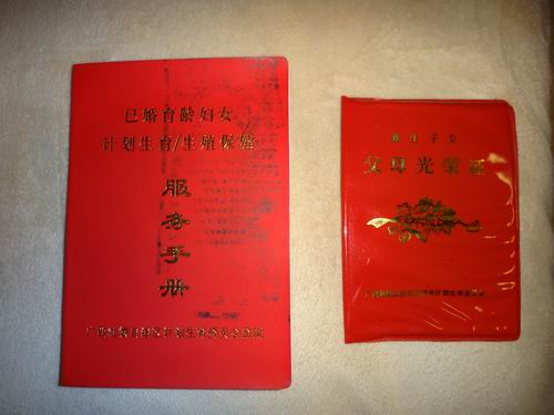 中国では夫婦が子供を産む前にこの左側の「計画生育の服務手冊」を申請する必要があります。すなわち「子供を造る」「ライセンス」だといってもいいです。もしこの「ライセンス」がなければ、罰金を納めることになっています。そして右側のは一人の子どもを持つ夫婦へ配った「光栄証」です。