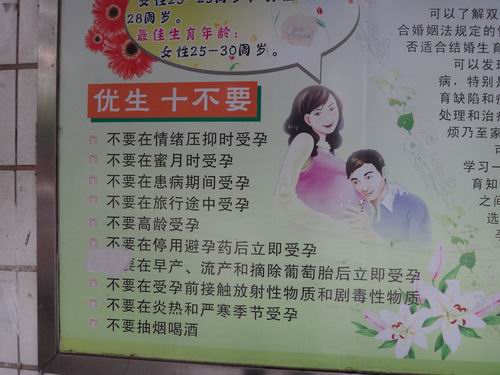 ステーションの壁に産児制限についての壁新聞がいっぱい飾っています。たとえば「妊娠時の十大禁物」が明記されています。