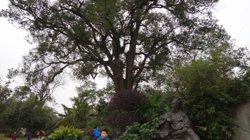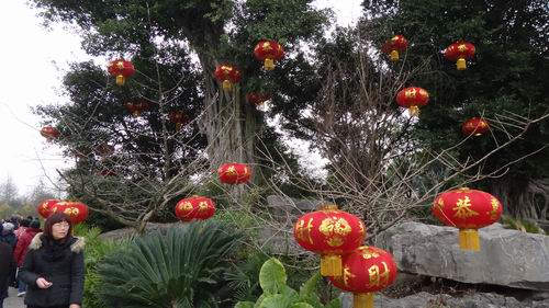 公園の大木にお正月お祝いにたくさんの提灯が飾られています。いかにも中国らしい飾り付けですね。
