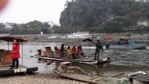 川面で普段でも筏で市内の漓江を遊覧する観光客が多いです