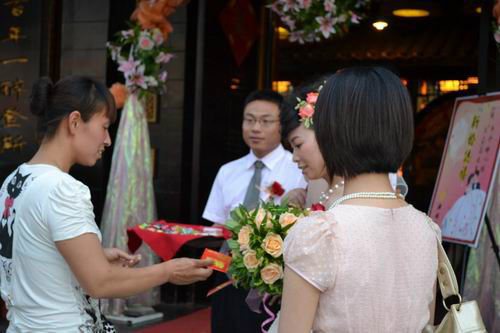 結婚宴会が始まる前に、新郎新婦が親友からのお祝い金(赤い紙に包まれた御捻り)を受ける習慣がありますが、中国では間柄や地方により、金額が違います。