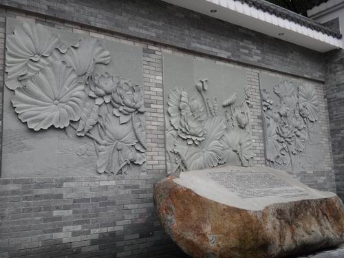 青石で町作りのテーマとマッチしたとされる蓮の花の模様は鮮やかに浮き彫りにされています。