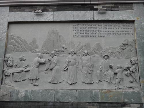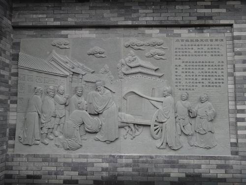 長さ210Mあり、幅11Mの街に登場した人物がすべて唐代から清朝にかけての役人の等身大のブロンズ像であり、そして、210Mも長い古風の石造りの壁なのです。頑丈な青石に人物や風景などを浮き彫りにして見事に立体感を作り出しています。そして古風の煉瓦をふんだんに使っているから、なおさらそのイメージが強まっています。ブロンズ像であろうと、古風の壁のレリーフであろうと、いずれも細工がよく施されており、かなりの出来栄えだと思います。これらの「役人」は記載によると桂林生まれの人もいれば他所から転職してくれた人もいました。彼らは歴史上、自分の一生を人民に奉仕したと伝えられ、芳名を千載に残したとされています。街全体に古代の「清官」を仰ぐとする清い「清官文化」の雰囲気も漂っています。そこで「古蓮文化街」という名がありました。そのために、この街は「桂林廉政教育基地」とも指定されています。人民に一生を尽くした役人のことは永遠に人民に仰がれて記念されるべきでしょう。そこを通った通行人が思わず足を止めて記事を読んだり写真を撮ったりしていました。街は管理者が務めて毎日、きれいに掃除されており、散策だけでも気持ちのいい街です。
