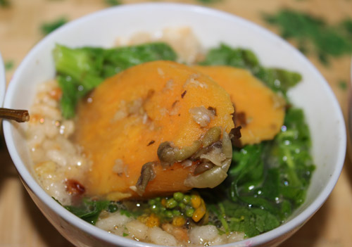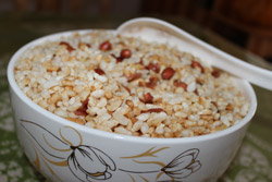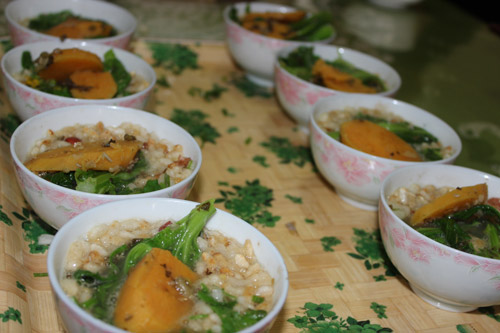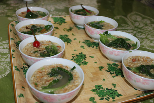 作り方:まず、油茶を作るための専用の鍋を用意し、最初に「糖茶」を作ります。糖茶は鍋にお茶葉、生姜、黒糖或いは砂糖、水を入れて沸かしたら出来上がりです。糖茶は主に胃を清潔にし、食欲を促進する効果があります。お客様がいるのに「糖茶」を作らなければ、極めて無礼な接客方法にあたると言われるほど重要なものとされています。糖茶を飲んだら、油茶を作り始めます。主な材料はお茶葉、炒米、ビーフン或いは麺で、他にも緑豆やサヤエンドウ、カボチャ、野菜、サツマイモなどを鍋に入れて煮込みます。出来上がったら、ビーフン、炒米及び葱、唐辛子の漬物などを入れた茶碗にお茶を注ぎます。残った食材は細かく砕いて、二杯目、三杯目の油茶に加えます。灌陽油茶は黄金色で、口当たりもよく、「篩油茶」には「一杯目は苦く、二杯目は渋い、三杯目、四杯目は美味しい油茶」という俗語があります。これはお客様に対して「ゆっくり油茶を味わってください」という気持ちを込めて生まれたものとされています。