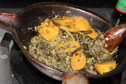 材料:スペアリブ、お茶葉、葱、キノコ、緑豆、野菜、炒米(お湯で蒸したもち米を乾燥させ、油で揚げたもの。日本の糒に似ている。)、ビーフン或いは麺、ピーナッツ、塩、味の素、黒糖或いは砂糖などの調味料。