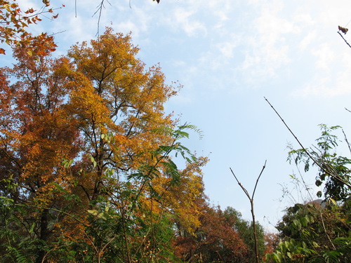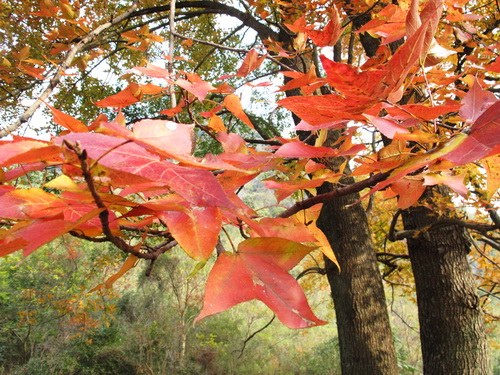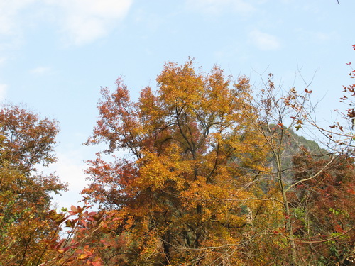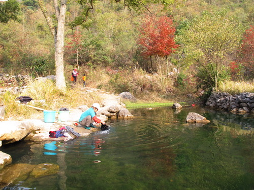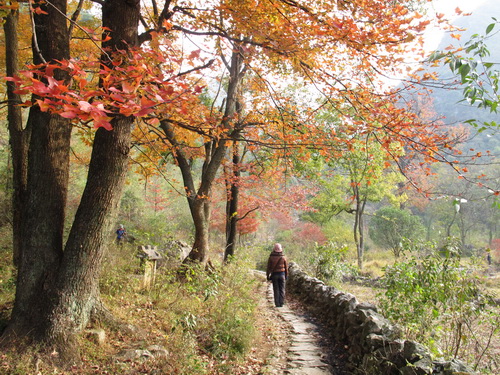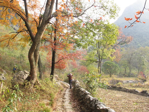 私たちが当時の商人たちが歩いた道に沿って山を登る途端に一筋の光が雲の隙間から射し出して、周りは瞬間明るくなり、振り返ってみると、青い山とカーキ色の畑を背景に赤い紅葉と緑の川などからなった一幅の秋の水墨画が目の前に展開しました。