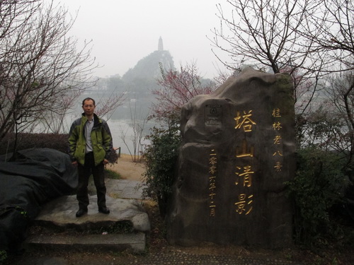 昨日、友達の韓さんと穿山公園へ梅の花見に行くと約束したので、今朝の7時に彼の家の近くの信号機の所に会合してから一緒に穿山公園の方へ向かいました。まだ薄暗くて、町が静かで、途中にはあまりに出会いませんでした。昨夜ちょっと雨が降りました。雨上がりの清らかな空気を吸いながら散歩して、とてもいい気持ちでした。10分ぐらい歩いて、穿山公園に着きました。周りは少し明るくなり始まりました。朝の小東江は目覚めたばかりのようで、静かに公園を流れ通っていました。水面に一筋の湯気が立っていて、塔山が鏡のような水面に映って、水墨画のように見えました。山頂にある寿仏塔は明時代に作られた八角の煉瓦の塔で、数百年以来いつまでもこのように小東江の畔に佇んきました。この景色は「塔山清影」と言い、桂林の古い八景の一つです。中国の代明の有名な旅行家徐霞客が桂林に訪れた時に小舟に乗ってここを見物した後、「穿山遊記」を書いたことがあります。