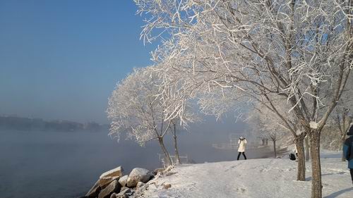 筆者にとって樹氷はかねてから何とかして見に行きたいものでした。そのために朝早く起きて、ホテルのロビーで地元の人に尋ねました。ところが地元の人に「樹氷は今日、駄目でしょう。気温がよほど低くないと見えないよ、風もないとみえないし」と言われました。筆者が少しこの話に落胆しましたが、一か八か行ってみようと決心しました。ここまで来た以上、行ってみないと一生の悔いになるかもしれないとも考えました。そこで朝7時半ごろ朝食を早く済ませ、タクシーを拾うことに決めました。市内のホテルから約15キロほど離れた松花江の豊満水力発電所の方向に向かいました。タクシーがおよそ20分ほど走ると、遠くに川面からいよいよ霧が立ち込めているのが見えました。「しめたぞ!今日、樹氷が見える」とタクシーの運転手は筆者を安堵させたような口ぶりで言ってくれました。確かに薄くて寒い朝霧の中に松花江の川面が現れ、あの銀色に輝き、ふわふわした毛皮のような樹氷がいっぱい見えたのではないですか。あの岸の樹木のすべてを美しく白く化粧した世界が一瞬に童話の世界のようにも見えました。