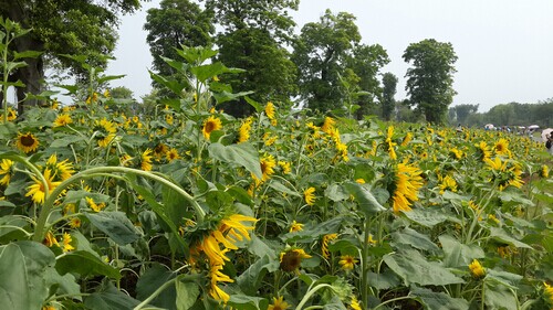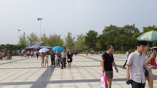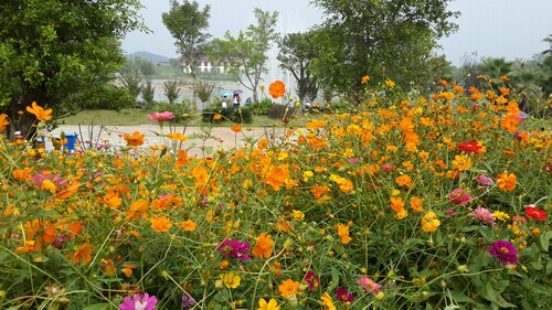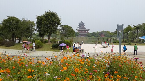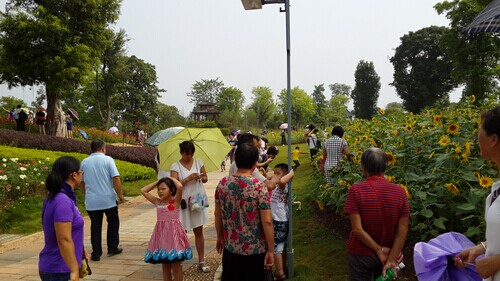 筆者は今年の10月1日の建国記念日のレジャーを利用し、市内から20キロほど離れた桂林園博園に行きました。その日は晴れて気温が30度ほどで観光には少し暑いほどでした。それにもかかわらず訪れた市民や観光客で賑わい、祭り気分でした。やはり園博園に栽培したひまわりやコスモスなどの花の情報はテレビで広く広めた甲斐があったと思います。報道によると園内にはやく5万本ほどのひまわりなどが栽培されたといいます。これではかなりのボリュームだと考え、ぜひ見逃してはいけないと思い、家族を連れて見に行くことにしたわけです。さすがに休日と宣伝の効果だけあって家族連れの入園者が思うより多かったです。