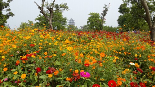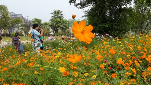 桂林園博園は実に一昨年に開園したものです。当時広西自治区が開催した園芸博覧会の会場でした。敷地面積が延べ80ヘクタールもにも及び、桂林におけるもっとも広い公園だと言われます。園内に入ると、前にまず高さ48メートルの「大雁閣」が遠くに見えました。左側に道順に南寧園をはじめとした自治区の14の都市が企画した庭園は整然として並びました。それらよりも人気がコスモスとひまわりのあたりに集まったようです。よく見ればこれらの花はちょうど満開を迎え、タイミングよく観光客の訪れを待っているように感じました。これらのきれいな花をバッグにポーズを取ったり表情を整えて写真を撮る人が少なくありませんでした。中に立ち入り禁止の看板を無視した人もいました。ちょっと気に食わないところでした。それにしても確かに筆者にとっても迫力のある花の世界であり感動しました。