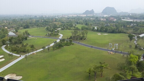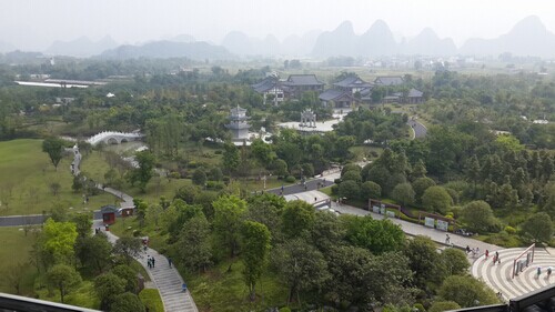 大雁閣の上から眺めた園内の一部の景色で、遠くに桂林らしい風景も見えました