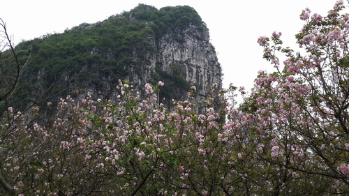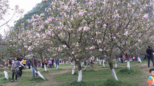 筆者はこの間、桂林の南渓山の桜の開花についてのブロッグを書きましたが、それは開花のプロローグには過ぎなく、桂林ではあまり大きい反響を呼ぶものではなかったです。最近、気温の急上昇により、夏並みの暑さになりました。おそらく桜園の開花はチラホラではないかと憶測していました。これに合わせたかのようにお墓参りと春の遠足を目的とする清明節が折よく始まりました。今日の午後、暇を利用し南渓山の桜園を訪れました。中国の法律による清明節のための三日間の最終日に当たりますが、昨日より気温が10度ほど下がり、明日から天候も悪くなるうえ、雨が降る予報が出ていますから、「善は急げ」ですから、見に行くことにしたわけです。正直に言って、この開花をあのブロッグを書いた後、ずっと待ち遠しい気持ちでした。公園の近くに車を止めると、一眼のカメラを携帯した観光客らしき何人かが足早に入口の方に急ぐのが見えました。目を凝らしてみれば園内の桜の木に白い模様があることがわかり、人々もそのあたりに動いていました。案の定、ほぼ期待通りの開花でした。