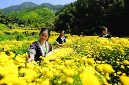 現在、龍勝県の黄菊は旬に入り、地元の少数民族の侗族の方は好天のうちに黄菊を摘むのを急いでいます。近年来、龍勝県の各自治県は黄菊の栽培を拡大させ、当地の大自然に恵まれている生態環境を利用し、お茶として使える黄菊産業を大いに発展させようとしています。当地の農家の増収にも励んでいるということです。